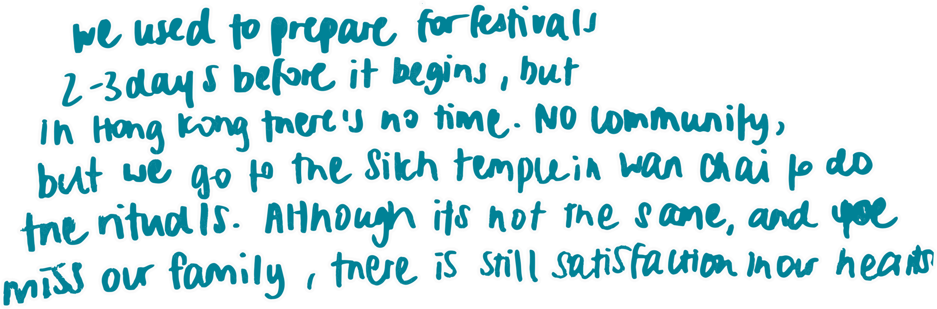 “Belonging to me means your home culture, how you celebrate festivals, and how much time you give to family members. We used to prepare for festivals 2 - 3 days before it begins, but in Hong Kong there’s no time. No community, but we go to the Sikh temple in Wan Chai to do the rituals. Although it’s not the same, and we miss our family, there is still satisfaction in our hearts.”